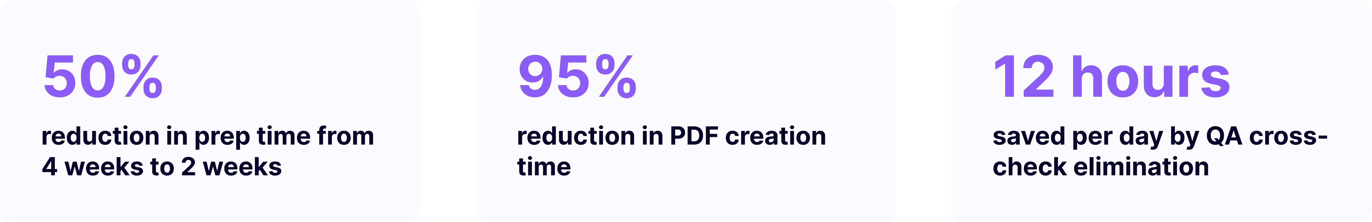 - Prep time cut from four weeks to two — a 50% % reduction in hours